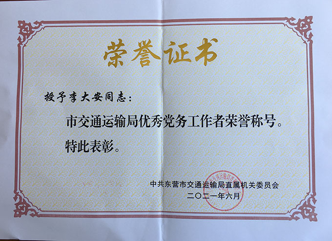 • 李大安榮獲“市交通運(yùn)輸局優(yōu)秀黨務(wù)工作者”